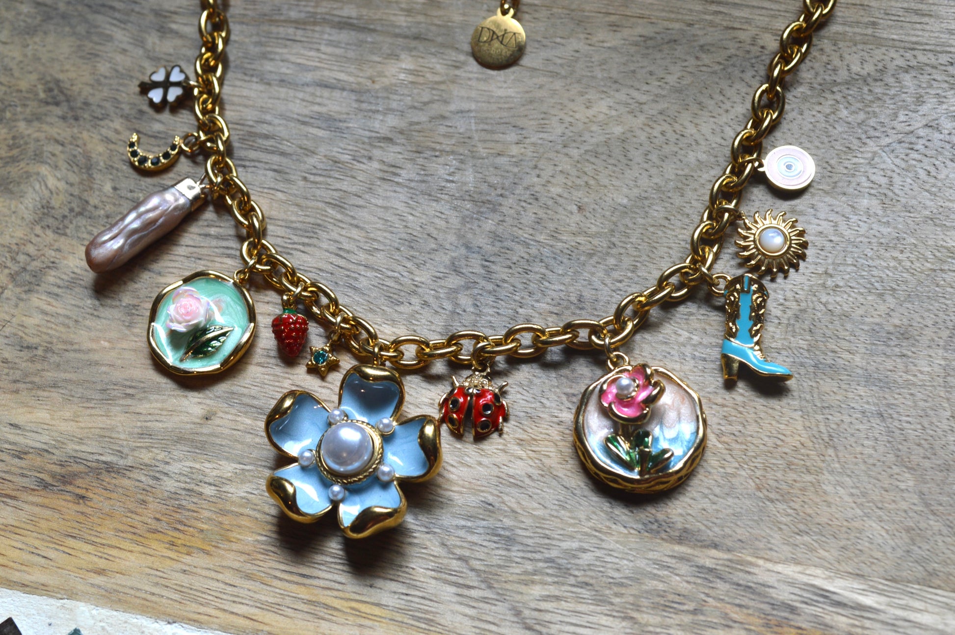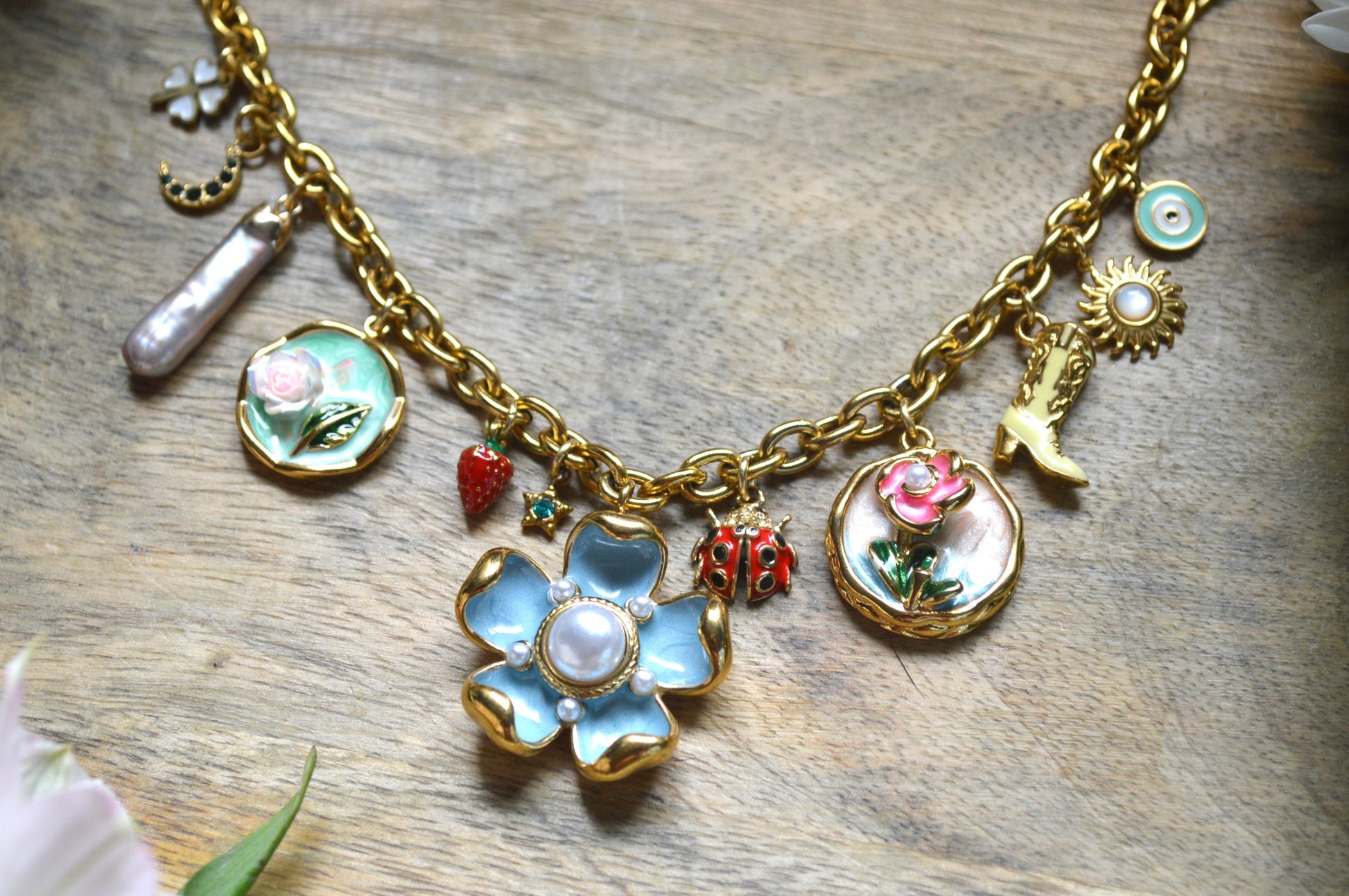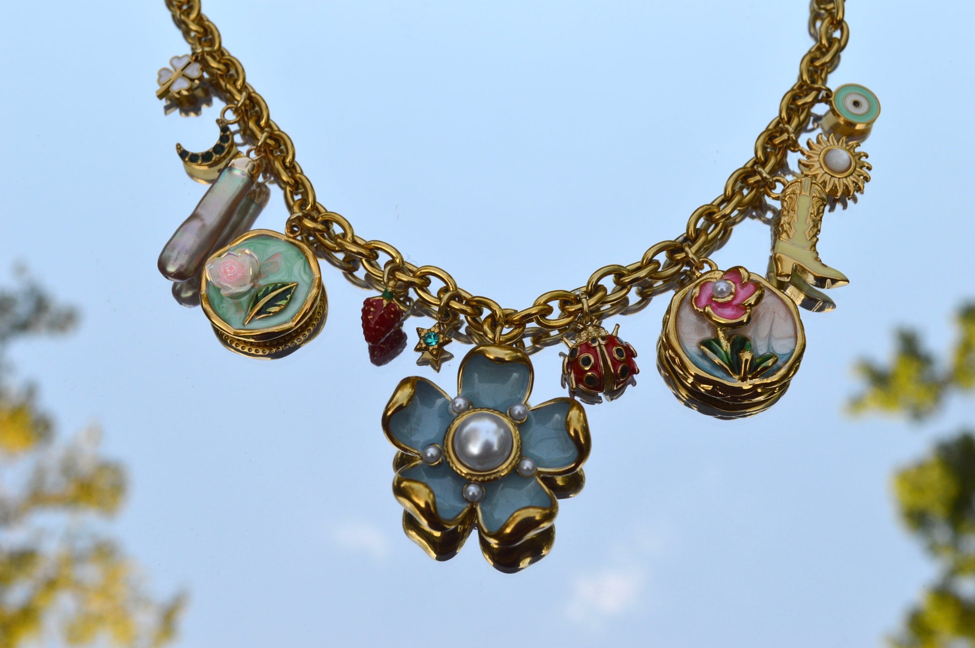 a clover for luck. a crescent moon of gems. a baroque pearl because the world is your oyster.